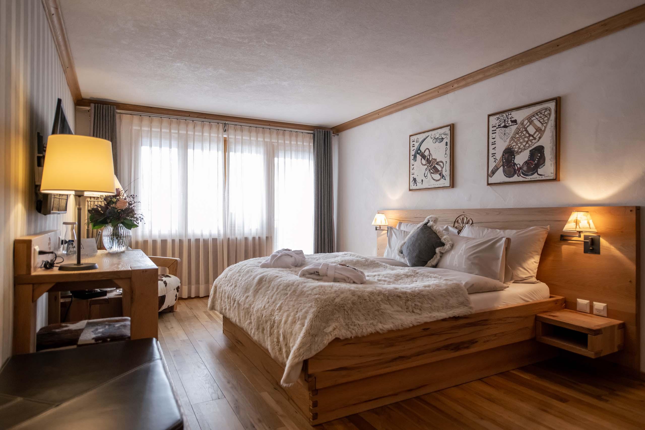 Grosszügige Zimmer im modernen Alpenstil – geprägt von liebevollen Details und wohligem Komfort. Wo der Blick vom Südbalkon oder der privaten Terrasse in die Bündner Bergwelt schwebt, wird der Moment zum alpinen Deluxe Erlebnis und das Übernachten in Graubünden zum Traum.