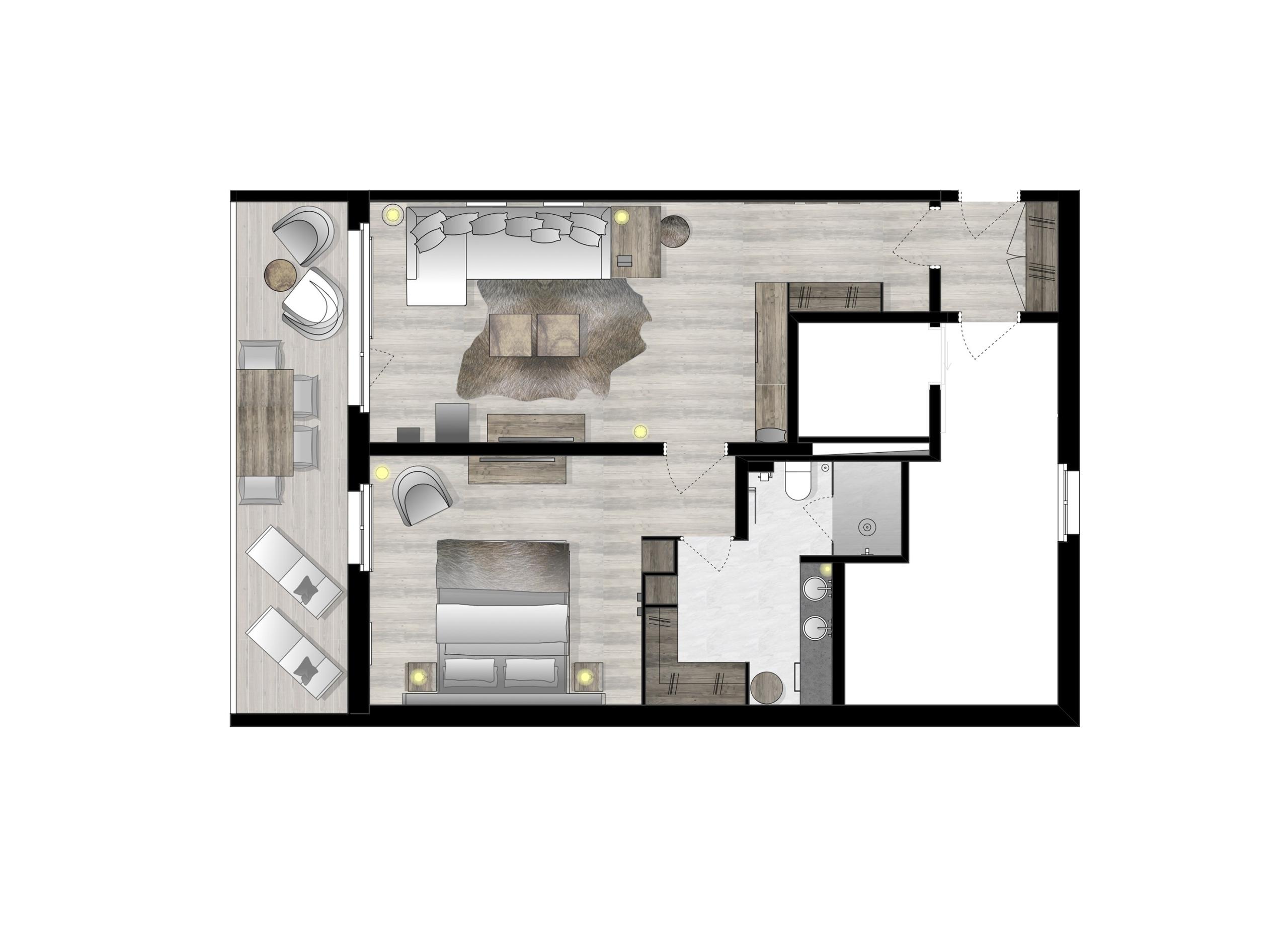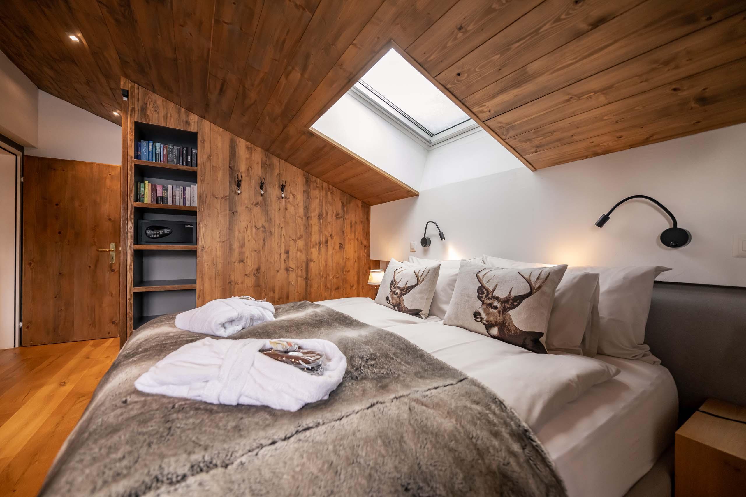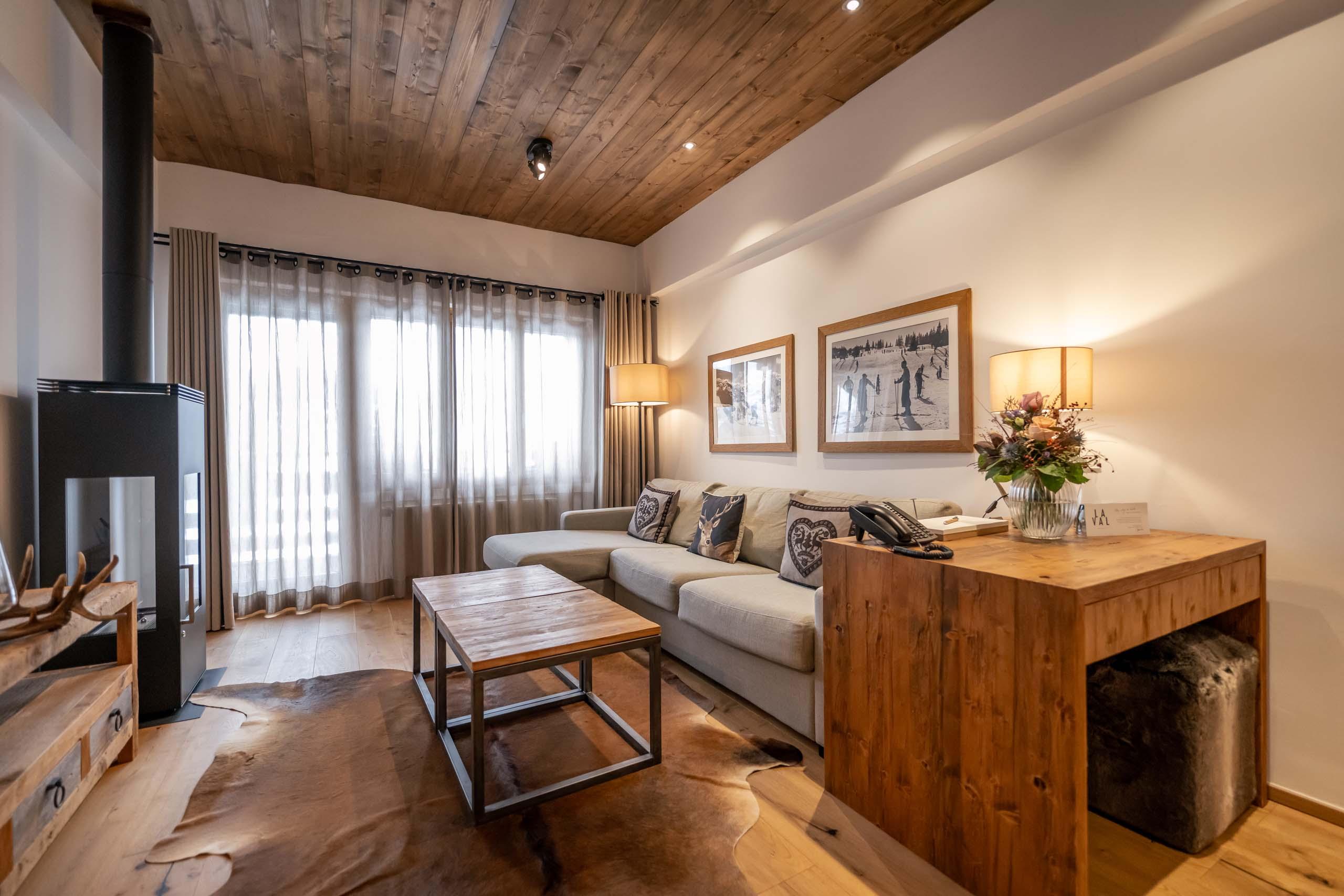 Das Effekt-Cheminée im Wohnbereich sorgt für einen wohlig warmen Empfang – und eine knisternde Atmosphäre. Ein grosszügiges Wohn- und Schlafzimmer mit Bad en suite lädt zum Wohlfühlen ein.